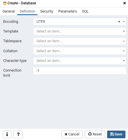 In the Definition tab, you can select the encoding, a template, tablespace, collation, character type, and connection limit.